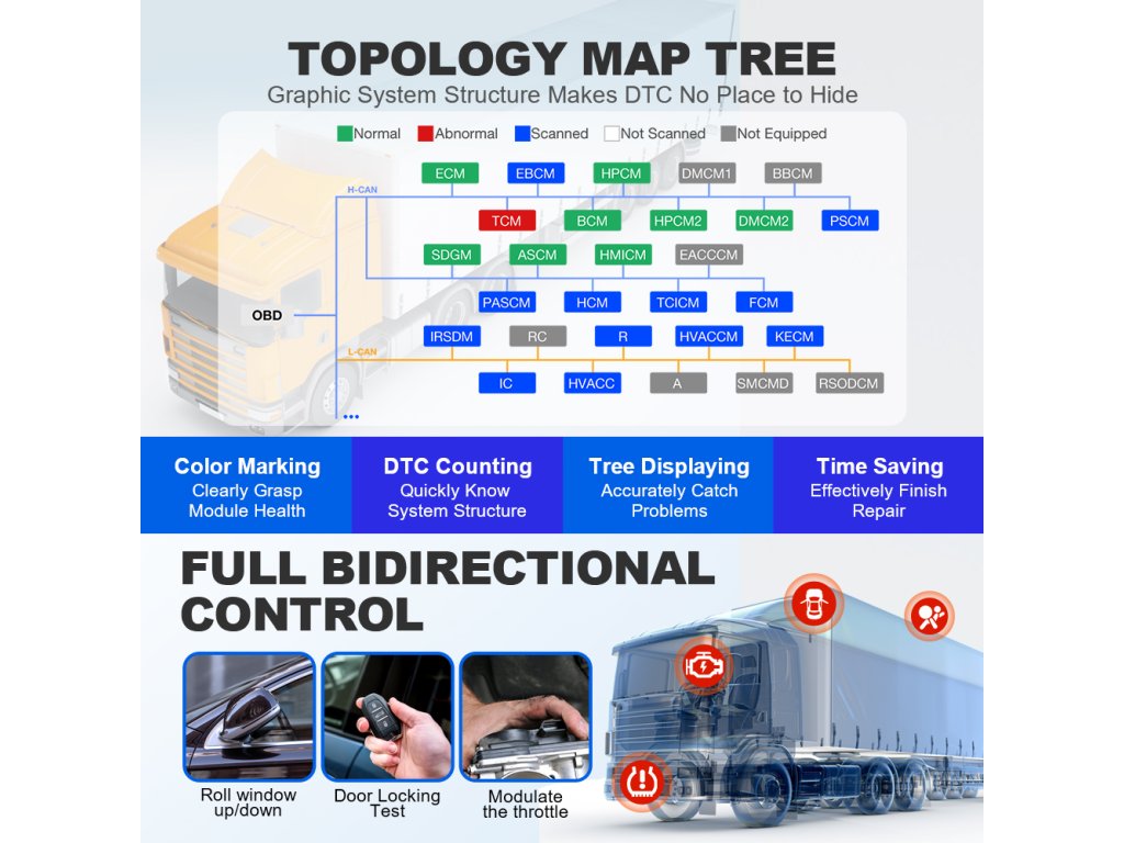 - Підтримка OBD II, HD OBD, CAN, CAN FD, DoIP та інших протоколів.
